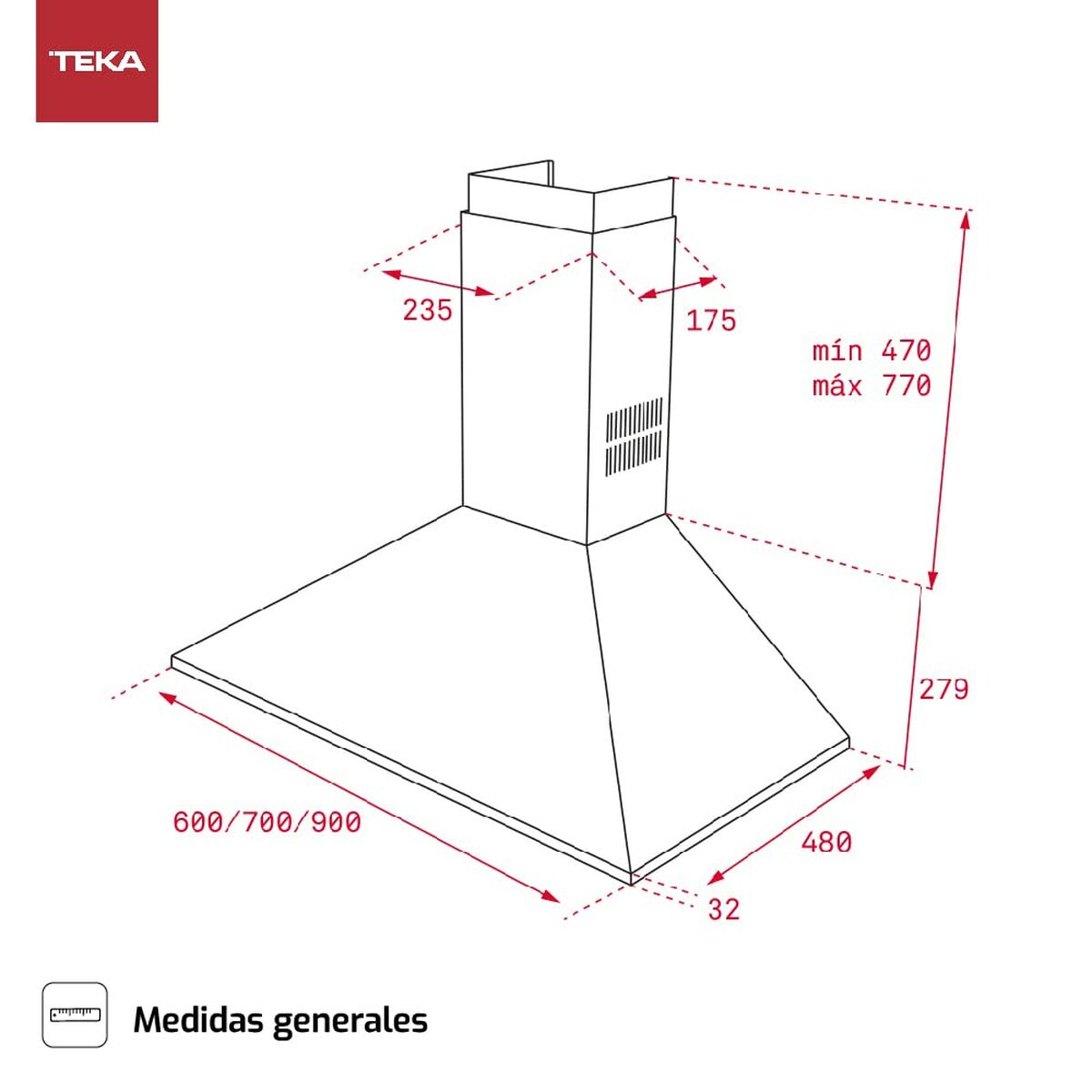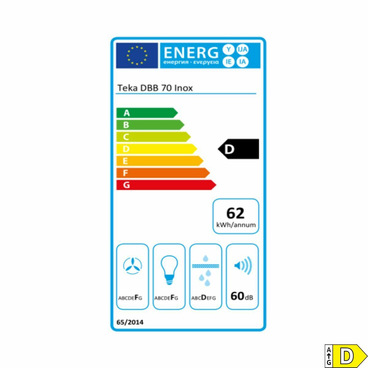 Teka DBB 60/70/90. Μέγιστη ισχύς εξαγωγής: 440 m³/h, Τύπος εξαγωγής: Αυλωτή / επανακυκλοφορία. Τύπος: Επιτοίχιο, Χρώμα προϊόντος: Ανοξείδωτο ατσάλι, Ισχύς λαμπτύρα: 40 W. Τύπος φίλτρου: Μέταλο. Ισχύς κινητήρα: 195 W. Πλάτος: 700 mm, Βάθος: 480 mm, Ύψος: 749 mm