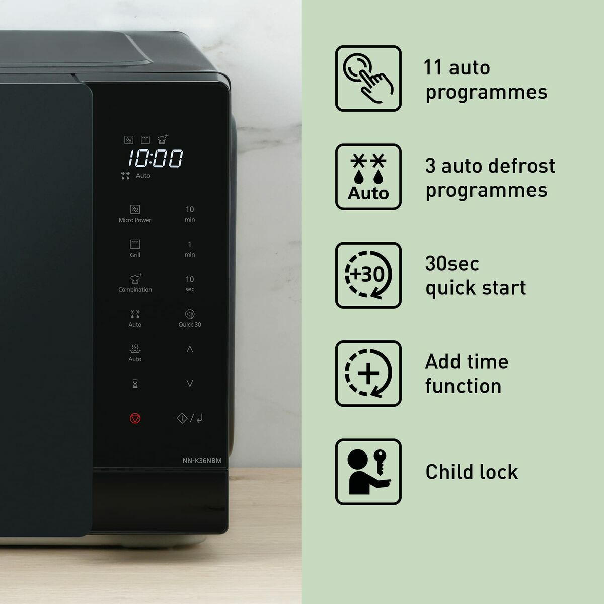 Ο φούρνος μικροκυμάτων Panasonic μοντέλο NNK36NBMEPG σε μαύρο χρώμα συνδυάζει λειτουργικότητα και πρακτικότητα με μοντέρνο και λιτό σχεδιασμό, κατάλληλο για κάθε σύγχρονη κουζίνα. Με ισχύ 1000 W, αυτός ο φούρνος μικροκυμάτων επιτρέπει το γρήγορο και αποδοτικό ζέσταμα και μαγείρεμα τροφίμων, βελτιώνοντας τον χρόνο προετοιμασίας των καθημερινών γευμάτων. Η χωρητικότητα 23 λίτρων προσφέρει επαρκή χώρο για μεσαίου μεγέθους δοχεία, ιδανική τόσο για ατομική χρήση όσο και για μικρές οικογένειες. Μεταξύ των βασικών χαρακτηριστικών του είναι το κλείδωμα για παιδιά, ένα σύστημα ασφαλείας που αποτρέπει τυχαίες χρήσεις, ειδικά σε σπίτια με μικρά παιδιά, προσφέροντας ηρεμία και πρόληψη ατυχημάτων. Επιπλέον, διαθέτει εσωτερικό φωτισμό που διευκολύνει την παρακολούθηση της διαδικασίας μαγειρέματος χωρίς να χρειάζεται να ανοίξετε την πόρτα, συμβάλλοντας σε συνεχή και πρακτικό έλεγχο. Η ενσωματωμένη οθόνη βελτιώνει την εμπειρία χρήστη, εμφανίζοντας καθαρά τις πληροφορίες και επιτρέποντας εύκολο και άνετο χειρισμό των προγραμματιζόμενων λειτουργιών. Αυτός ο φούρνος μικροκυμάτων Panasonic, γνωστός για την αξιοπιστία και την τεχνολογία του για το σπίτι, προσφέρει ισορροπία μεταξύ ισχύος, χωρητικότητας και βασικών λειτουργιών ασφαλείας και άνεσης, καθιστώντας τον αποτελεσματική λύση για την καθημερινή χρήση στην κουζίνα.
