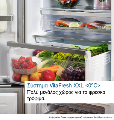 Το ευρύχωρο σύστημα αποθήκευσης και φρεσκάδας VitaFresh XXL <0°C> προσφέρει το ιδανικό περιβάλλον αποθήκευσης για τα φρέσκα τρόφιμα. Διατηρεί χαμηλότερες θερμοκρασίες για το ψάρι και το κρέας και κρατά πραγματικά φρέσκα τα φρούτα και τα λαχανικά σου.