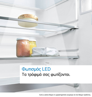 Ο LED φωτισμός σε βοηθά να βλέπεις ξεκάθαρα ό, τι περιέχει το ψυγείο σου. Οι λυχνίες LED έχουν μεγαλύτερη διάρκεια ζωής σε σχέση με τις συμβατικές και φωτίζουν το εσωτερικό της συσκευής με άπλετο, λαμπερό, λευκό φως. Επιπλέον, είναι πλήρως εντοιχιζόμενες και προσφέρουν καθαρό και ομοιόμορφο φωτισμό, χωρίς να θαμπώνει, όλων των τροφίμων μέσα στο ψυγείο.